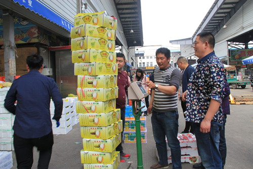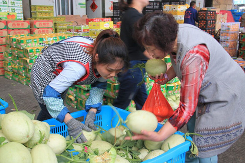 在通农物流水果交易区,除了苹果、梨、草莓等春季水果外,卖得最好的要数新上市的夏令水果,尤其各种甜瓜热销:青皮的玉菇、黄皮的久红瑞,口感软嫩 5元/500克;白皮的东方蜜,肉质脆甜,5.5元/500克;海南的西州蜜肉黄甜脆4.5元/500克。在通农物流西瓜专卖区,品种不少,价格不一,云南西瓜2.2元/500克,山东西瓜2.8元/500克,崇明西瓜3元/500克,东台8424西瓜3.52.8元/500克,海南麒麟瓜5元/500克,早春红玉、特小凤3元/500克。
