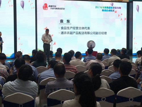 南通通农农副产品配送有限公司副总经理袁东作为食品生产企业代表参加了本次启动仪式,并进行了发言。袁总主要从食品生产者的角度出发,从如何落实好食品安全主体责任、如何严把食品生产关保障食品安全、如何立足自身当食品生产企业行业模范等方面讲述了企业对食品安全肩负的社会责任和法律责任,并承诺在南通创建食品安全示范城过程中,通农冷链配送将严格执行并贯彻好《食品安全法》各项要求,强化责任意识、担当意识、自我监督意识,以实际行动为食品安全城市创建作出应有的贡献。(冷链配送 高俊燕)