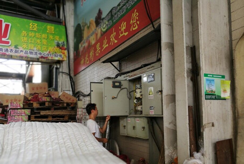 高温天气用电量逐渐增大,后勤工作中还是需要对交易区用电负荷进行检查。物业科电工对水果区、熟食区大棚里的配电总开关进行了安全检查,两个区的总体用电情况相对良好,未出现总开关过热、电流过大等危险情况。对存在安全隐患的摊位,客服中心要求水果区责成经营户将配电箱及电线附近的杂物进行整理,在配电箱旁边预留一条通道,便于电工及时对配电开关进行维护,对违规用电、使用不合格电线等也向经营户提出了整改要求。