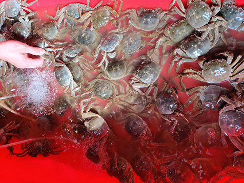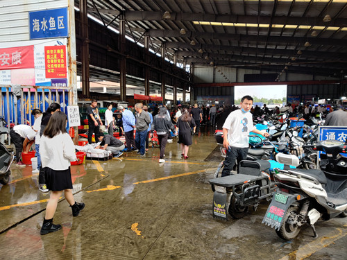 在水产海鲜大棚,刚捕捞上岸的带鱼、鲳鱼、小黄鱼、梭子蟹的等新鲜海产品琳琅满目,南美对虾、罗氏虾、大闸蟹应有尽有,整个市场被浓浓的节日气氛包围。