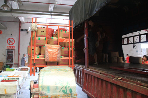 36岁的盐城人杨毅和他老婆在交易区卖菜,主要经营全国各地的季节性直发菜品。分为北菜和南菜。北菜主要从内蒙古张北和甘肃兰州发至市场。南菜主要从云南昆明发至市场。他告诉记者今年菜价总体不高,比往年低了很多。由于外地天气恶劣,雨水较多,直发蔬菜在运输过程中出现的损耗较多,尤其西红柿、辣椒这种不易存放的蔬菜损耗最大。由于市场进一步扩大直发客菜区,杨毅在通农物流冷库房囤积460吨北菜和南菜,让市民能购买到价廉物美的新鲜蔬菜。