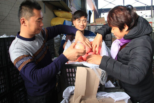 学金果业是通农物流里的苹果销售大户,主营陕西洛川冰糖心红富士,批发3.2-4.8元/斤不等。老板张坤告诉记者,在市区水果市场,同等价位根本买不到如此优质的苹果,多半都要贵到近五成。