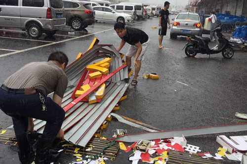 8月17日,暴风雨来袭时,现场人员发现好几家商铺广告牌有脱落现象,干货区领导小组迅速组织人员一一排查,及时清理了脱落的广告牌,并对现场进行隔离,同时物业科人员积极配合处理现场,由于及时发现,及时处理,避免了人员伤害。此外,对各片区积水情况进行监督,必要时组织足够的排涝工具进行强排,确保经营户正常经营和财产安全。