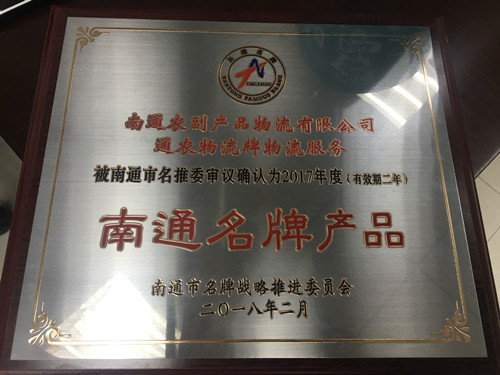2018年2月,经南通市名牌战略推进委员会审议确认拼搏官方网站通农物流牌物流服务为“2017年度(有效期二年)南通名牌产品”。