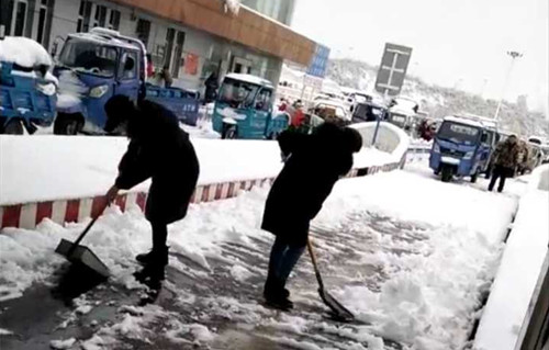 蔬菜区启动恶劣天气应急预案,在岗员工纷纷拿起铁锹,顶着刺骨寒风铲扫厚厚的积雪,为经营户铲出一条又一条安全通行道路;在弯道等重要路段撒盐融雪,防止路面结冰,杜绝安全隐患;工作人员在棚内加强安全巡查,做到防患于未然;利用场内显示屏、经营户微信群,提供安全提示,提醒经营户们做好防雪、防冻准备,做到安全出行。
