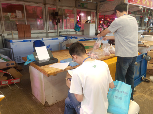 5月28日,市市场监督管理局委托检测机构对通农物流进行抽检。在水产区现场工作人员的带领下,检测人员抽检了猪肉、牛肉、淡水鱼、虾4种水产品。现场经营户也积极配合,对食品安全工作非常认同。