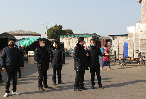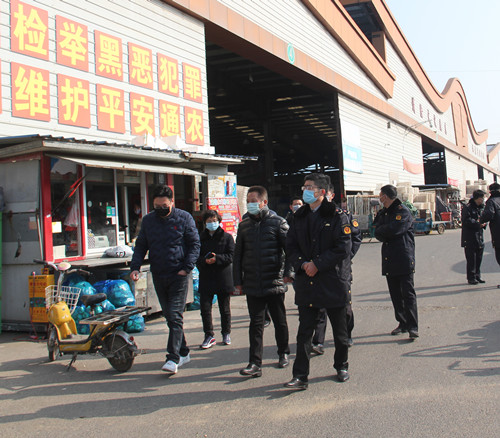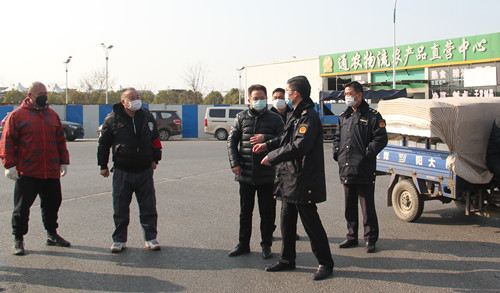通农物流总经理徐径首先向黄局长介绍了通农物流在市场内采取的防疫手段和防疫方法,黄局长也对通农物流市场的防疫工作表达了肯定,不论是不断循环提醒的扬声器,还是随处可见的指使标牌和逢车必检的工作人员,黄局长都对通农物流接地气的宣传方式表示了赞赏。黄局长强调,要全面调动市场内所有的宣传资源,一定要用经营户们理解的通俗易懂的方式方法向他们宣传防疫的重要性,杜绝形式主义!蔬菜区经理吕剑表示,特殊时期蔬菜区也重新安排了工作人员,在人员数量上做减法,减少人员流通,但在工作内容上做加法,人员虽然减少但绝不耽误工作。