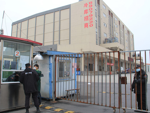 今天是实行封闭式管理的第一天,可以看到,通农物流位于静海大道东侧的市场西大门入口现已关闭,仅开放出口,所有大小车辆(含电瓶车等非机动车),均由位于崇川路北侧的市场南门进入。为方便员工进出场,公司特意在冷库增开了员工临时停车场,仅供公司员工上下班通过,外来人员进入冷库均必须戴口罩登记身份证并测量体温后方可进入。