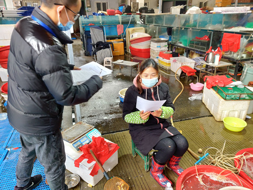 “老板,今年质量监督检验所不能到场给电子秤年检,需要你们自己用手机注册登录上传信息,这是年审流程,您看一下,有什么不明白的可以来问我们。”11月28日水产区工作人员挨家挨户向经营户发放 《关于做好市场各类电子秤年检的通知》,并详细解释申报流程。