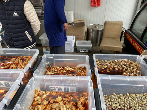 为了丰富水产肉类交易区经营品种,满足老百姓一站式购买配套需求,方便老百姓,水产肉类交易区近期又在水产大棚中间过道新增3间店面(经营项目符合食品安全要求,且品种不与交易区店面、摊位发生大的冲突),其中一家经营即食海鲜的店面已经开始营业,主营腌制好的虾、鱿鱼须、象拔蚌、泥螺等即食海鲜,为老百姓带来了便利。刚开业没几天,即食海鲜就很受消费者欢迎,刚买完大鱼大肉的老百姓,都要来买些不一样的即食海鲜回家尝尝,享受即将过年的喜悦。(水产区 陈旭鹏)