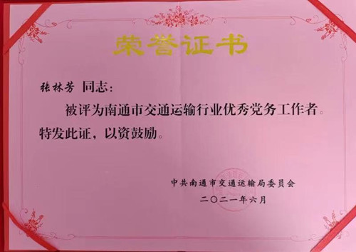 在伟大的中国共产党100周年华诞之际,通农物流喜讯连连。通农物流第二党支部获得“江苏省交通运输行业先进党支部”荣誉称号,通农物流党总支获得“南通市交通运输行业先进基层党组织”荣誉称号,通农物流陈斌、冯晓逸、王倩同志获得“南通市交通运输行业优秀共产党员”荣誉称号,通农物流张林芳同志获得“南通市交通运输行业优秀党务工作者”荣誉称号。在集团党委的带领下,通农物流党总支充分发挥战斗堡垒作用,让党旗在基层一线高高飘扬: